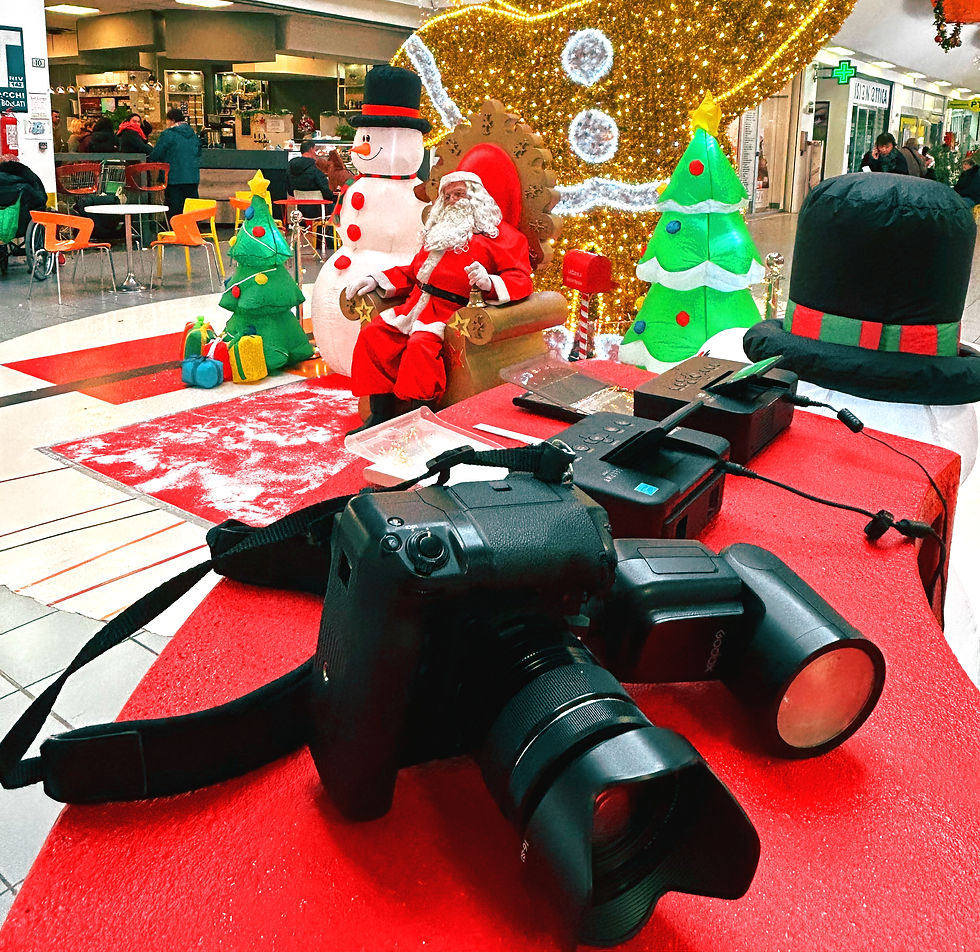 Seduto sul suo trono, Babbo Natale aspetta i bambini per fare una foto che potrà essere ritirata al momento, abbinata ad una cornice o ad un addobbo per l'albero di casa.